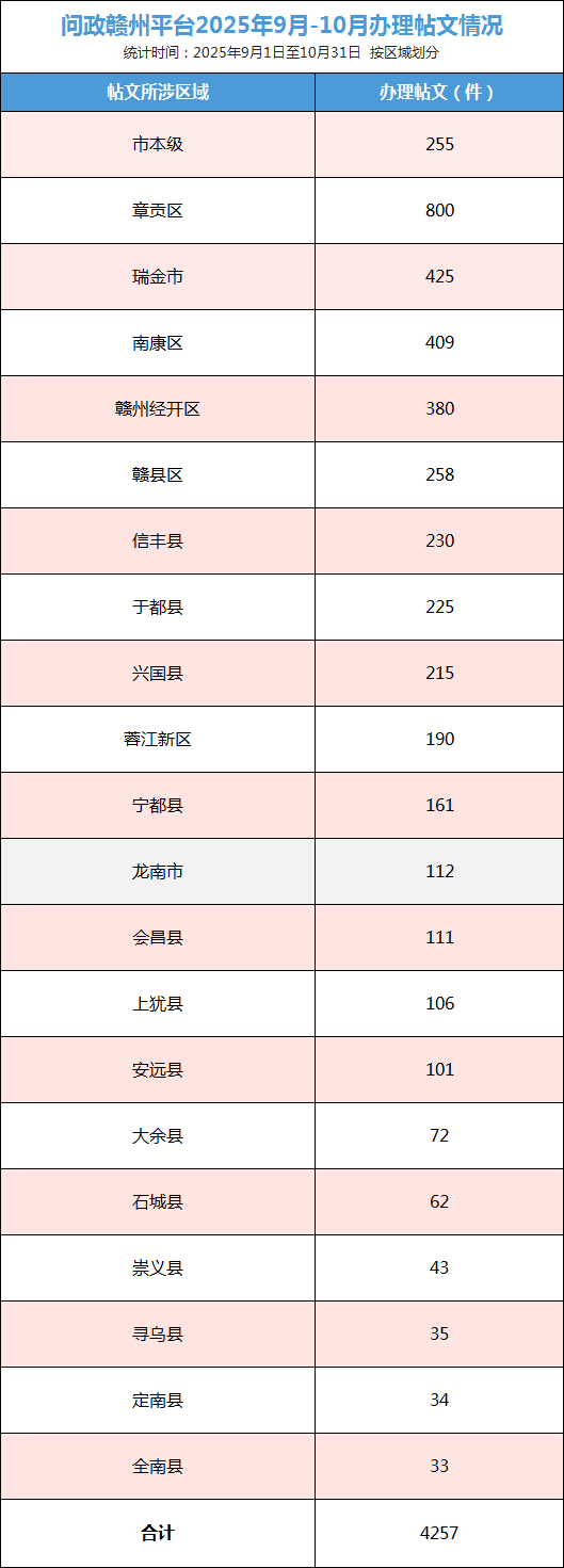 “问政赣州”网络问政平台自2019年7月10日运行以来,截至2025年10月31日,转办网友投诉咨询帖文167570件,办理回复167366件,办理回复率99.87%。